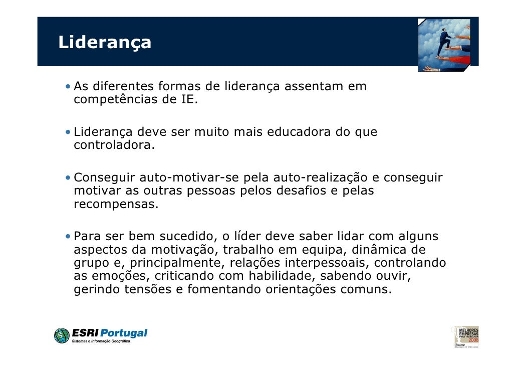 19. 19. Liderança• As diferentes formas de liderança assentam em competências de IE.• Liderança deve ser muito mais educadora do que controladora.• Conseguir auto-motivar-se pela auto-realização e conseguir motivar as outras pessoas pelos desafios e pelas recompensas.• Para ser bem sucedido, o líder deve saber lidar com alguns aspectos da motivação, trabalho em equipa, dinâmica de grupo e, principalmente, relações interpessoais, controlando as emoções, criticando com habilidade, sabendo ouvir, gerindo tensões e fomentando orientações comuns.