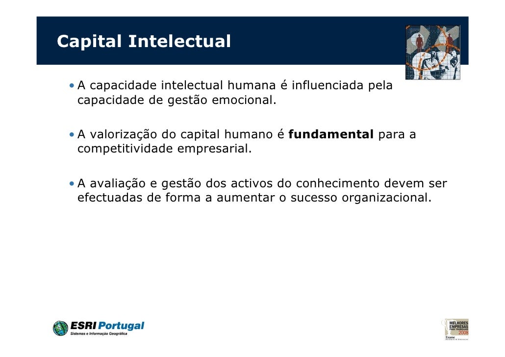 22. 22. Capital Intelectual • A capacidade intelectual humana é influenciada pela capacidade de gestão emocional. • A valorização do capital humano é fundamental para a competitividade empresarial. • A avaliação e gestão dos activos do conhecimento devem ser efectuadas de forma a aumentar o sucesso organizacional.