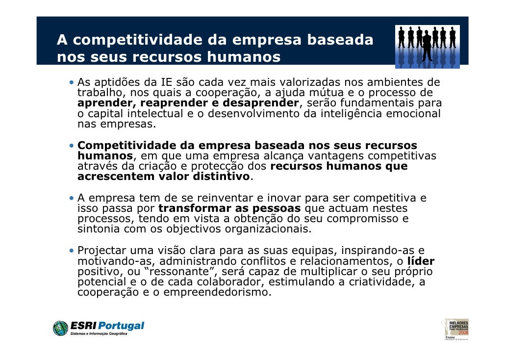 23. 23. A competitividade da empresa baseadanos seus recursos humanos • As aptidões da IE são cada vez mais valorizadas nos ambientes de trabalho, nos quais a cooperação, a ajuda mútua e o processo de aprender, reaprender e desaprender, serão fundamentais para o capital intelectual e o desenvolvimento da inteligência emocional nas empresas. • Competitividade da empresa baseada nos seus recursos humanos, em que uma empresa alcança vantagens competitivas através da criação e protecção dos recursos humanos que acrescentem valor distintivo. • A empresa tem de se reinventar e inovar para ser competitiva e isso passa por transformar as pessoas que actuam nestes processos, tendo em vista a obtenção do seu compromisso e sintonia com os objectivos organizacionais. • Projectar uma visão clara para as suas equipas, inspirando-as e motivando-as, administrando conflitos e relacionamentos, o líder positivo, ou “ressonante”, será capaz de multiplicar o seu próprio potencial e o de cada colaborador, estimulando a criatividade, a cooperação e o empreendedorismo.