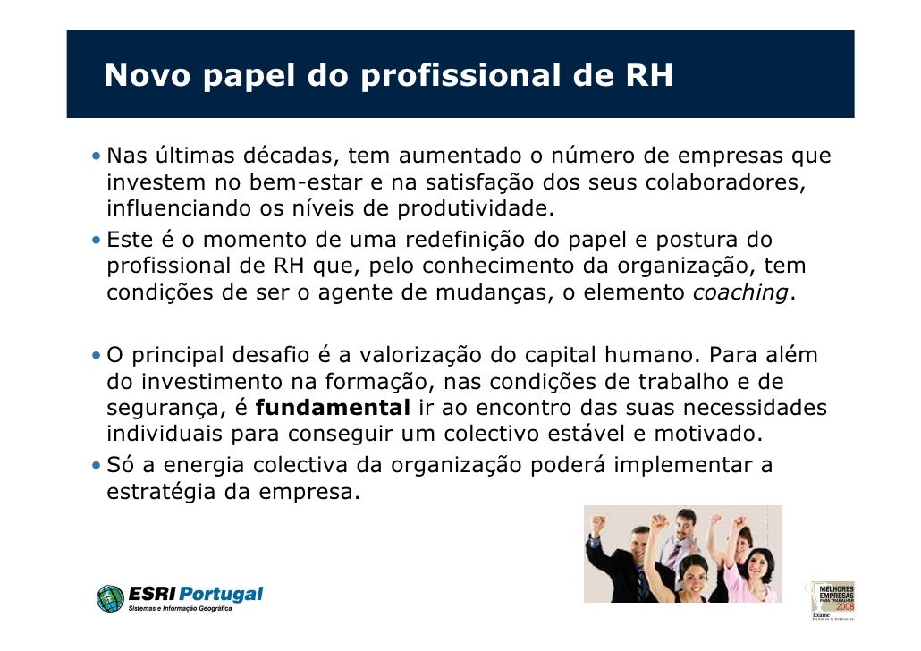 24. 24. Novo papel do profissional de RH• Nas últimas décadas, tem aumentado o número de empresas que investem no bem-estar e na satisfação dos seus colaboradores, influenciando os níveis de produtividade.• Este é o momento de uma redefinição do papel e postura do profissional de RH que, pelo conhecimento da organização, tem condições de ser o agente de mudanças, o elemento coaching.• O principal desafio é a valorização do capital humano. Para além do investimento na formação, nas condições de trabalho e de segurança, é fundamental ir ao encontro das suas necessidades individuais para conseguir um colectivo estável e motivado.• Só a energia colectiva da organização poderá implementar a estratégia da empresa.