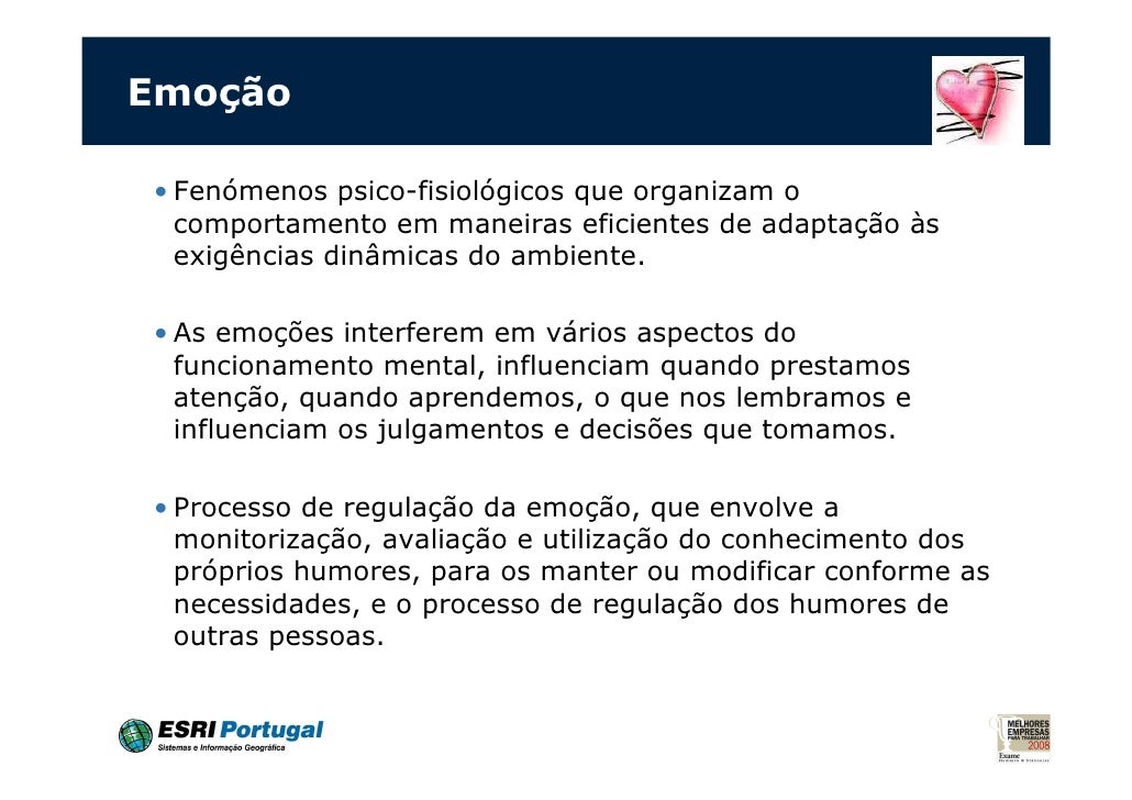 4. 4. Emoção• Fenómenos psico-fisiológicos que organizam o comportamento em maneiras eficientes de adaptação às exigências dinâmicas do ambiente.• As emoções interferem em vários aspectos do funcionamento mental, influenciam quando prestamos atenção, quando aprendemos, o que nos lembramos e influenciam os julgamentos e decisões que tomamos.• Processo de regulação da emoção, que envolve a monitorização, avaliação e utilização do conhecimento dos próprios humores, para os manter ou modificar conforme as necessidades, e o processo de regulação dos humores de outras pessoas.