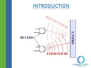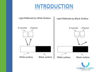The document provides information about IR LEDs and photodiodes, explaining that IR LEDs transmit infrared light, which is invisible to the naked eye, while photodiodes generate voltage based on light intensity. It distinguishes between digital and analog IR sensors, noting digital outputs are high or low, whereas analog outputs vary with light intensity. For further inquiries, contact information for Robo India is provided.