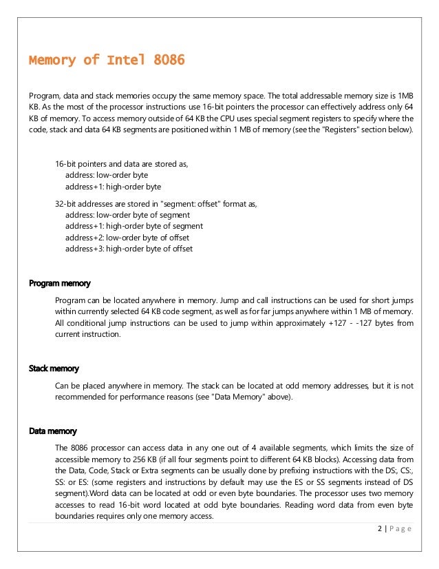 3. 3. 2 | P a g e Memory of Intel 8086 Program, data and stack memories occupy the same memory space. The total addressable memory size is 1MB KB. As the most of the processor instructions use 16-bit pointers the processor can effectively address only 64 KB of memory. To access memory outside of 64 KB the CPU uses special segment registers to specify where the code, stack and data 64 KB segments are positioned within 1 MB of memory (see the "Registers" section below). 16-bit pointers and data are stored as, address: low-order byte address+1: high-order byte 32-bit addresses are stored in "segment: offset" format as, address: low-order byte of segment address+1: high-order byte of segment address+2: low-order byte of offset address+3: high-order byte of offset Program memory Program can be located anywhere in memory. Jump and call instructions can be used for short jumps within currently selected 64 KB code segment, as well as for far jumps anywhere within 1 MB of memory. All conditional jump instructions can be used to jump within approximately +127 - -127 bytes from current instruction. Stack memory Can be placed anywhere in memory. The stack can be located at odd memory addresses, but it is not recommended for performance reasons (see "Data Memory" above). Data memory The 8086 processor can access data in any one out of 4 available segments, which limits the size of accessible memory to 256 KB (if all four segments point to different 64 KB blocks). Accessing data from the Data, Code, Stack or Extra segments can be usually done by prefixing instructions with the DS:, CS:, SS: or ES: (some registers and instructions by default may use the ES or SS segments instead of DS segment).Word data can be located at odd or even byte boundaries. The processor uses two memory accesses to read 16-bit word located at odd byte boundaries. Reading word data from even byte boundaries requires only one memory access.