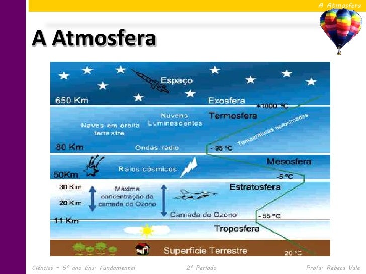 5. 5. A AtmosferaA Atmosfera• CAMADAS DA ATMOSFERA − Troposfera − Estratosfera − Mesosfera − Termosfera/Ionosfera − ExosferaCiências – 6º ano Ens. Fundamental 2º Período Profa. Rebeca Vale