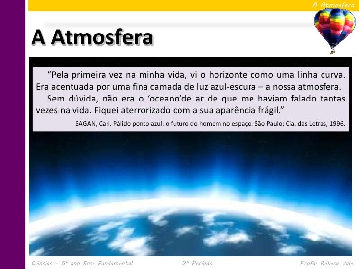 2. 2. A AtmosferaA Atmosfera “Pela primeira vez na minha vida, vi o horizonte como uma linha curva. Era acentuada por uma fina camada de luz azul-escura – a nossa atmosfera. Sem dúvida, não era o ‘oceano’de ar de que me haviam falado tantas vezes na vida. Fiquei aterrorizado com a sua aparência frágil.” SAGAN, Carl. Pálido ponto azul: o futuro do homem no espaço. São Paulo: Cia. das Letras, 1996.Ciências – 6º ano Ens. Fundamental 2º Período Profa. Rebeca Vale