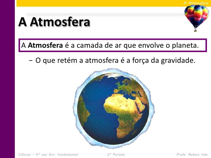 3. 3. A AtmosferaA Atmosfera•AA Atmosfera é a camada de arenvolve o planeta.. Atmosfera é a camada de ar que que envolve o − O que retém a atmosfera é a força da gravidade.Ciências – 6º ano Ens. Fundamental 2º Período Profa. Rebeca Vale