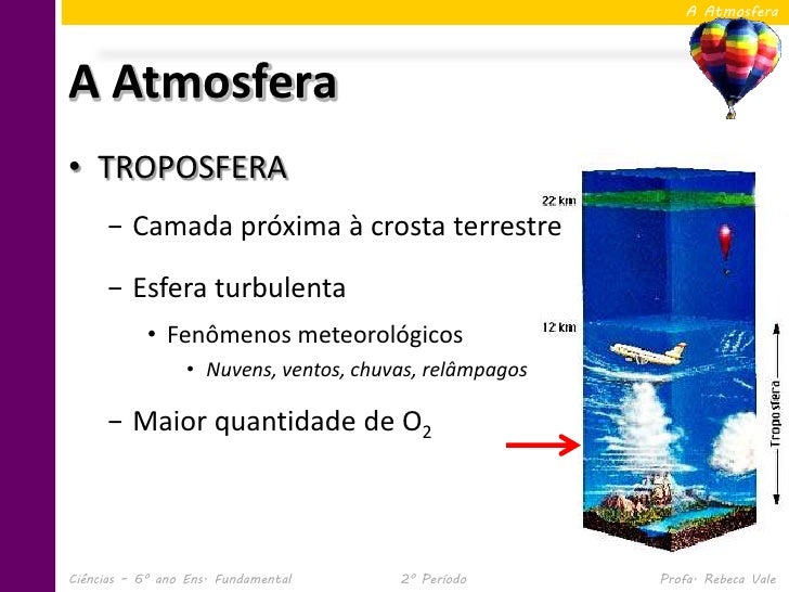6. 6. A AtmosferaA Atmosfera• TROPOSFERA − Camada próxima à crosta terrestre − Esfera turbulenta • Fenômenos meteorológicos • Nuvens, ventos, chuvas, relâmpagos − Maior quantidade de O2Ciências – 6º ano Ens. Fundamental 2º Período Profa. Rebeca Vale