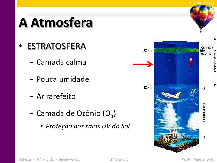 7. 7. A AtmosferaA Atmosfera• ESTRATOSFERA − Camada calma − Pouca umidade − Ar rarefeito − Camada de Ozônio (O3) • Proteção dos raios UV do SolCiências – 6º ano Ens. Fundamental 2º Período Profa. Rebeca Vale