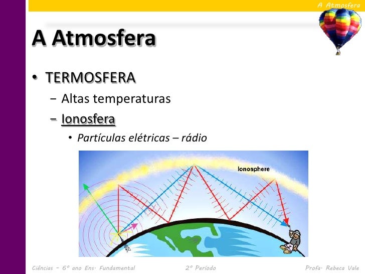 9. 9. A AtmosferaA Atmosfera• TERMOSFERA − Altas temperaturas − Ionosfera • Partículas elétricas – rádioCiências – 6º ano Ens. Fundamental 2º Período Profa. Rebeca Vale
