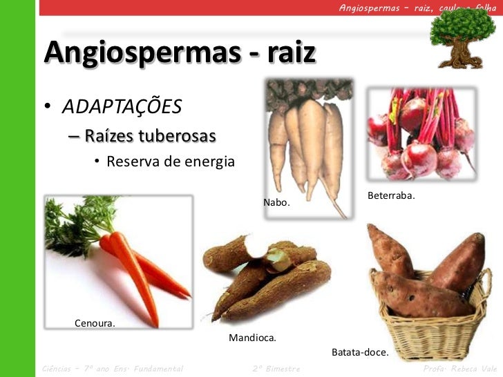 10. 10. Angiospermas – raiz, caule e folhaAngiospermas - raiz• ADAPTAÇÕES – Raízes tuberosas • Reserva de energia Beterraba. Nabo. Cenoura. Mandioca. Batata-doce.Ciências – 7º ano Ens. Fundamental 2º Bimestre Profa. Rebeca Vale