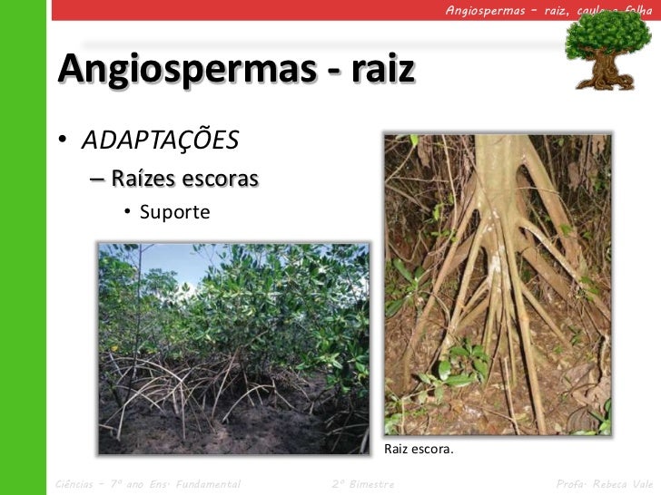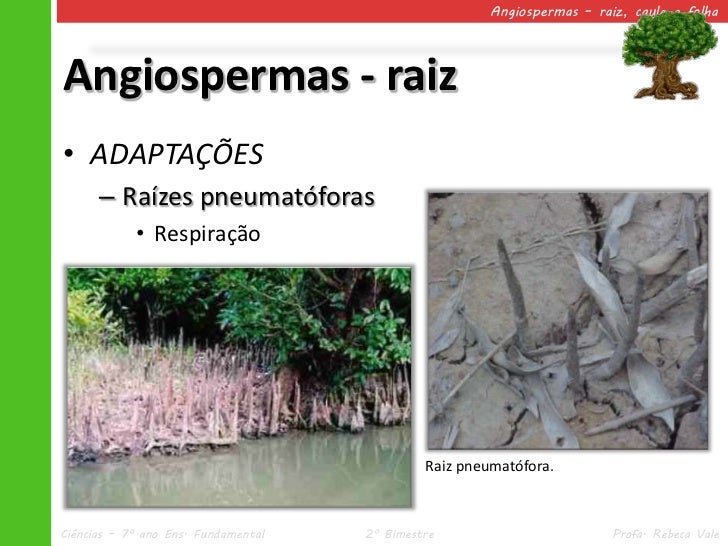 12. 12. Angiospermas – raiz, caule e folhaAngiospermas - raiz• ADAPTAÇÕES – Raízes pneumatóforas • Respiração Raiz pneumatófora.Ciências – 7º ano Ens. Fundamental 2º Bimestre Profa. Rebeca Vale