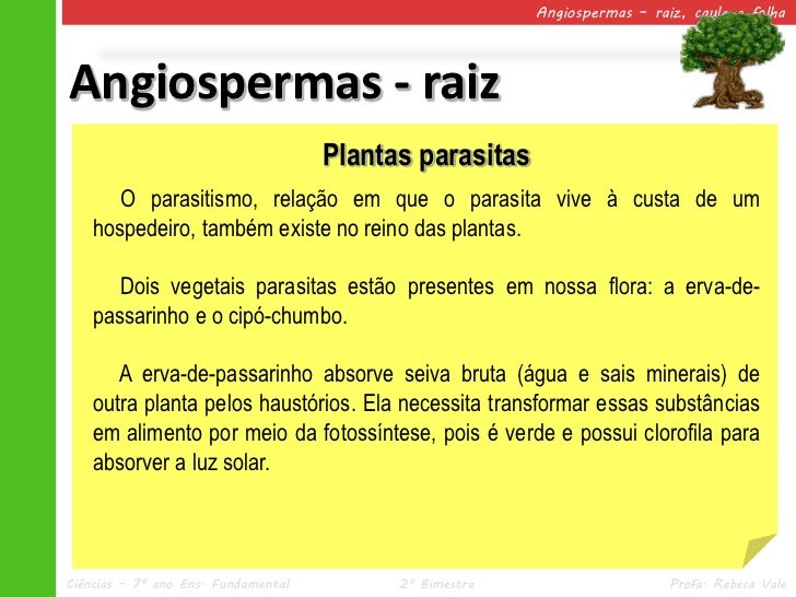 14. 14. Angiospermas – raiz, caule e folhaAngiospermas - raiz Plantas parasitas O parasitismo, relação em que o parasita vive à custa de um hospedeiro, também existe no reino das plantas. Dois vegetais parasitas estão presentes em nossa flora: a erva-de- passarinho e o cipó-chumbo. A erva-de-passarinho absorve seiva bruta (água e sais minerais) de outra planta pelos haustórios. Ela necessita transformar essas substâncias em alimento por meio da fotossíntese, pois é verde e possui clorofila para absorver a luz solar.Ciências – 7º ano Ens. Fundamental 2º Bimestre Profa. Rebeca Vale