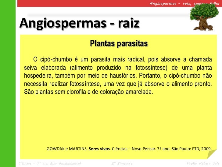 15. 15. Angiospermas – raiz, caule e folhaAngiospermas - raiz Plantas parasitas O cipó-chumbo é um parasita mais radical, pois absorve a chamada seiva elaborada (alimento produzido na fotossíntese) de uma planta hospedeira, também por meio de haustórios. Portanto, o cipó-chumbo não necessita realizar fotossíntese, uma vez que já absorve o alimento pronto. São plantas sem clorofila e de coloração amarelada. GOWDAK e MARTINS. Seres vivos. Ciências – Novo Pensar. 7º ano. São Paulo: FTD, 2009.Ciências – 7º ano Ens. Fundamental 2º Bimestre Profa. Rebeca Vale