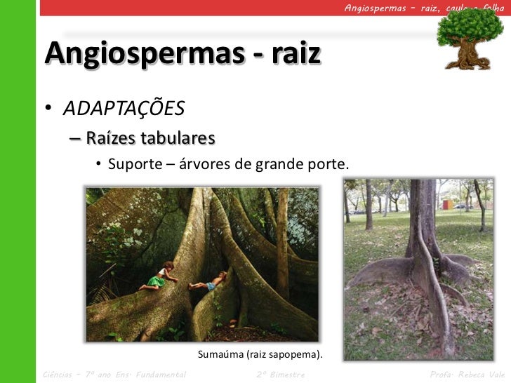 16. 16. Angiospermas – raiz, caule e folhaAngiospermas - raiz• ADAPTAÇÕES – Raízes tabulares • Suporte – árvores de grande porte. Sumaúma (raiz sapopema).Ciências – 7º ano Ens. Fundamental 2º Bimestre Profa. Rebeca Vale