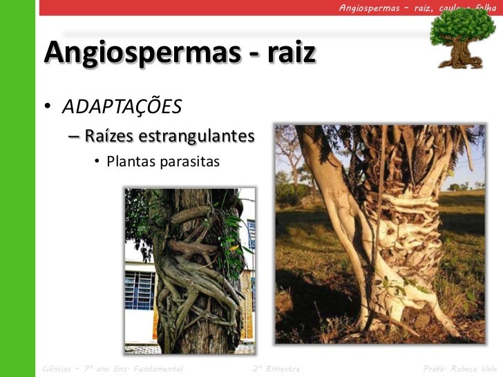 17. 17. Angiospermas – raiz, caule e folhaAngiospermas - raiz• ADAPTAÇÕES – Raízes estrangulantes • Plantas parasitasCiências – 7º ano Ens. Fundamental 2º Bimestre Profa. Rebeca Vale