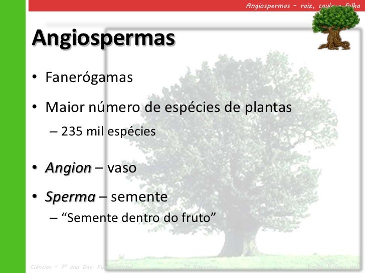 2. 2. Angiospermas – raiz, caule e folhaAngiospermas• Fanerógamas• Maior número de espécies de plantas – 235 mil espécies• Angion – vaso• Sperma – semente – “Semente dentro do fruto”Ciências – 7º ano Ens. Fundamental 2º Bimestre Profa. Rebeca Vale