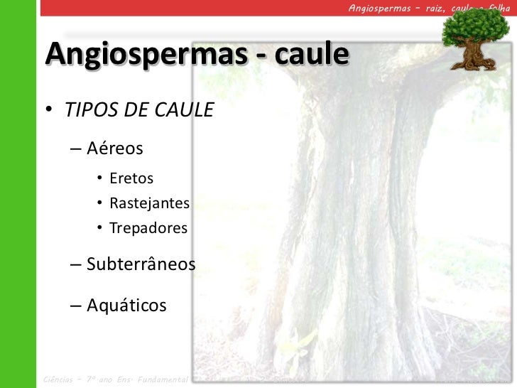 22. 22. Angiospermas – raiz, caule e folhaAngiospermas - caule• TIPOS DE CAULE – Aéreos • Eretos • Rastejantes • Trepadores – Subterrâneos – AquáticosCiências – 7º ano Ens. Fundamental 2º Bimestre Profa. Rebeca Vale
