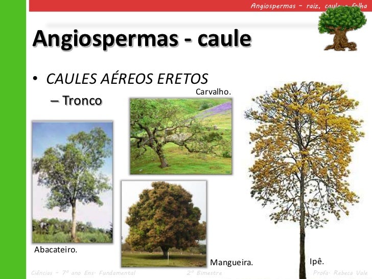 23. 23. Angiospermas – raiz, caule e folhaAngiospermas - caule• CAULES AÉREOS ERETOS Carvalho. – Tronco Abacateiro. Mangueira. Ipê.Ciências – 7º ano Ens. Fundamental 2º Bimestre Profa. Rebeca Vale