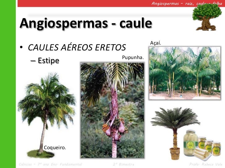24. 24. Angiospermas – raiz, caule e folhaAngiospermas - caule Açaí.• CAULES AÉREOS ERETOS Pupunha. – Estipe Coqueiro.Ciências – 7º ano Ens. Fundamental 2º Bimestre Profa. Rebeca Vale