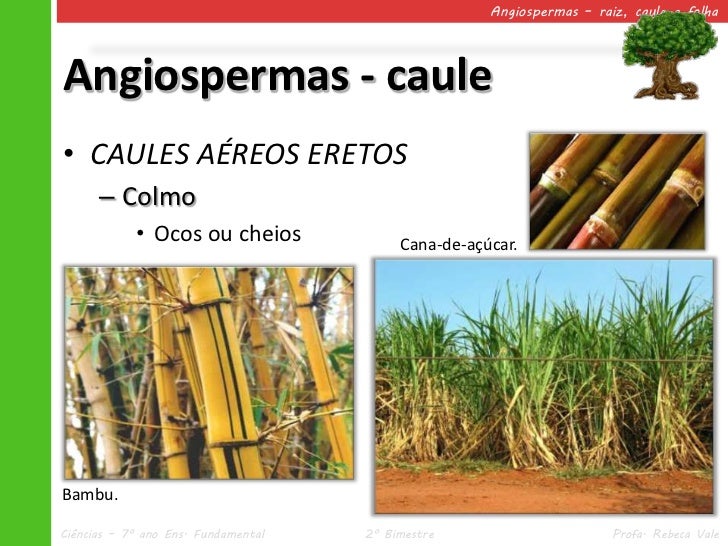 25. 25. Angiospermas – raiz, caule e folhaAngiospermas - caule• CAULES AÉREOS ERETOS – Colmo • Ocos ou cheios Cana-de-açúcar.Bambu.Ciências – 7º ano Ens. Fundamental 2º Bimestre Profa. Rebeca Vale