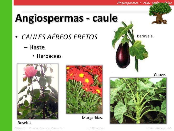 26. 26. Angiospermas – raiz, caule e folhaAngiospermas - caule• CAULES AÉREOS ERETOS Berinjela. – Haste • Herbáceas Couve. Margaridas. Roseira.Ciências – 7º ano Ens. Fundamental 2º Bimestre Profa. Rebeca Vale