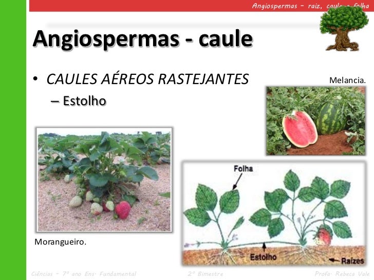 28. 28. Angiospermas – raiz, caule e folhaAngiospermas - caule• CAULES AÉREOS RASTEJANTES Melancia. – Estolho Morangueiro.Ciências – 7º ano Ens. Fundamental 2º Bimestre Profa. Rebeca Vale