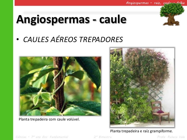 29. 29. Angiospermas – raiz, caule e folhaAngiospermas - caule• CAULES AÉREOS TREPADORES Planta trepadeira com caule volúvel. Planta trepadeira e raíz grampiforme.Ciências – 7º ano Ens. Fundamental 2º Bimestre Profa. Rebeca Vale