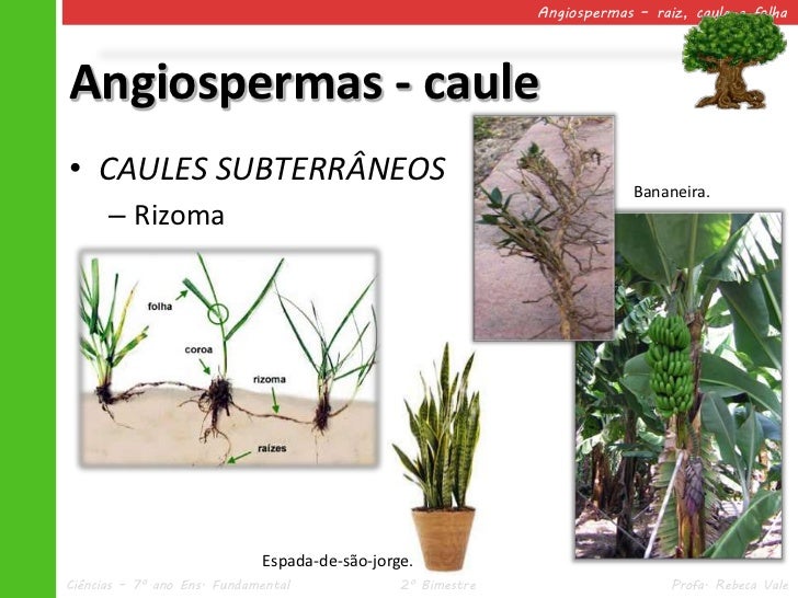 30. 30. Angiospermas – raiz, caule e folhaAngiospermas - caule• CAULES SUBTERRÂNEOS Bananeira. – Rizoma Espada-de-são-jorge.Ciências – 7º ano Ens. Fundamental 2º Bimestre Profa. Rebeca Vale