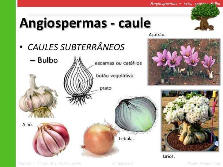 31. 31. Angiospermas – raiz, caule e folhaAngiospermas - caule Açafrão.• CAULES SUBTERRÂNEOS – Bulbo Alho. Cebola. Lírios.Ciências – 7º ano Ens. Fundamental 2º Bimestre Profa. Rebeca Vale