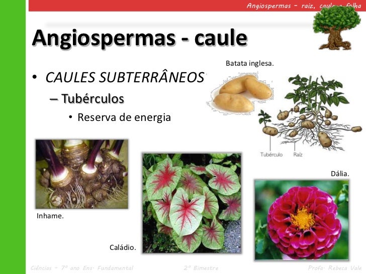 32. 32. Angiospermas – raiz, caule e folhaAngiospermas - caule Batata inglesa.• CAULES SUBTERRÂNEOS – Tubérculos • Reserva de energia Dália. Inhame. Caládio.Ciências – 7º ano Ens. Fundamental 2º Bimestre Profa. Rebeca Vale