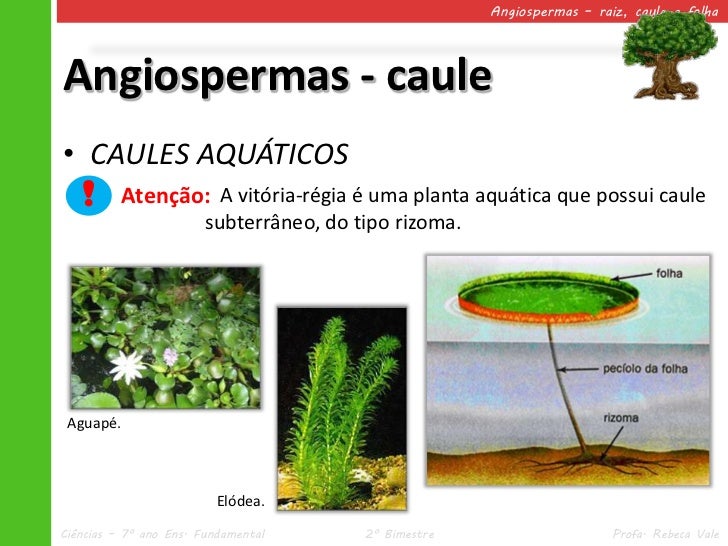 33. 33. Angiospermas – raiz, caule e folhaAngiospermas - caule• CAULES AQUÁTICOS ! Atenção: A vitória-régia é uma planta aquática que possui caule subterrâneo, do tipo rizoma. Aguapé. Elódea.Ciências – 7º ano Ens. Fundamental 2º Bimestre Profa. Rebeca Vale