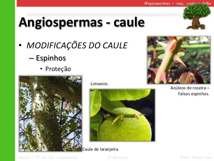34. 34. Angiospermas – raiz, caule e folhaAngiospermas - caule• MODIFICAÇÕES DO CAULE – Espinhos • Proteção Limoeiro. Acúleos de roseira – Falsos espinhos. Caule de laranjeira.Ciências – 7º ano Ens. Fundamental 2º Bimestre Profa. Rebeca Vale