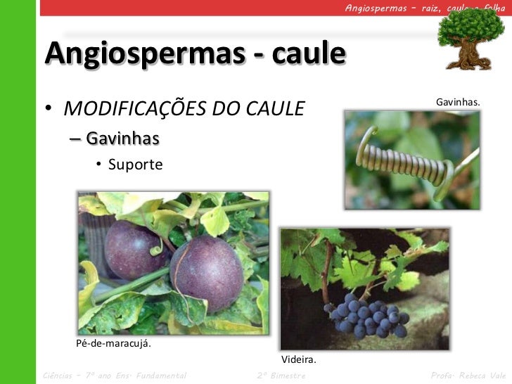 35. 35. Angiospermas – raiz, caule e folhaAngiospermas - caule• MODIFICAÇÕES DO CAULE Gavinhas. – Gavinhas • Suporte Pé-de-maracujá. Videira.Ciências – 7º ano Ens. Fundamental 2º Bimestre Profa. Rebeca Vale