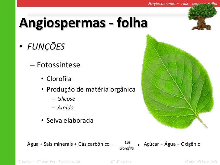 37. 37. Angiospermas – raiz, caule e folhaAngiospermas - folha• FUNÇÕES – Fotossíntese • Clorofila • Produção de matéria orgânica – Glicose – Amido • Seiva elaborada Luz Água + Sais minerais + Gás carbônico Açúcar + Água + Oxigênio clorofilaCiências – 7º ano Ens. Fundamental 2º Bimestre Profa. Rebeca Vale