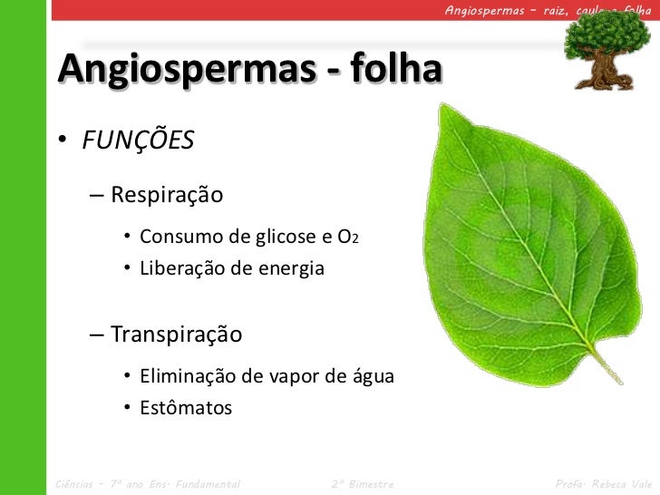 38. 38. Angiospermas – raiz, caule e folhaAngiospermas - folha• FUNÇÕES – Respiração • Consumo de glicose e O2 • Liberação de energia – Transpiração • Eliminação de vapor de água • EstômatosCiências – 7º ano Ens. Fundamental 2º Bimestre Profa. Rebeca Vale