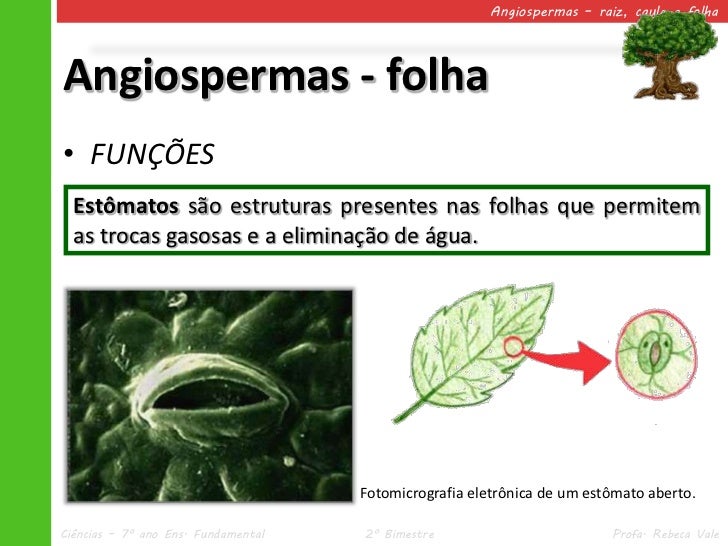 39. 39. Angiospermas – raiz, caule e folhaAngiospermas - folha• FUNÇÕES Estômatos são estruturas presentes nas folhas que permitem as trocas gasosas e a eliminação de água. Fotomicrografia eletrônica de um estômato aberto.Ciências – 7º ano Ens. Fundamental 2º Bimestre Profa. Rebeca Vale