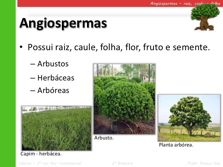 4. 4. Angiospermas – raiz, caule e folhaAngiospermas• Possui raiz, caule, folha, flor, fruto e semente. – Arbustos – Herbáceas – Arbóreas Arbusto. Planta arbórea. Capim - herbácea.Ciências – 7º ano Ens. Fundamental 2º Bimestre Profa. Rebeca Vale
