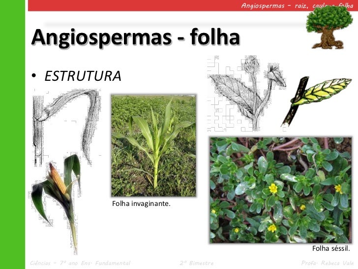 41. 41. Angiospermas – raiz, caule e folhaAngiospermas - folha• ESTRUTURA Folha invaginante. Folha séssil.Ciências – 7º ano Ens. Fundamental 2º Bimestre Profa. Rebeca Vale