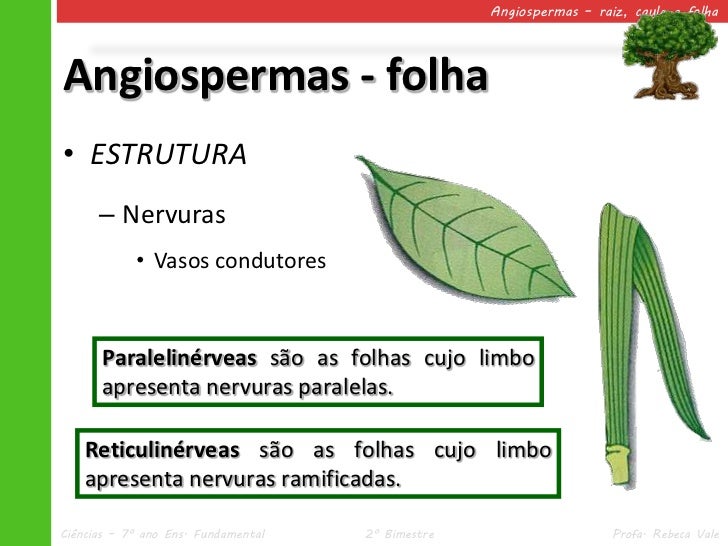 42. 42. Angiospermas – raiz, caule e folhaAngiospermas - folha• ESTRUTURA – Nervuras • Vasos condutores Paralelinérveas são as folhas cujo limbo apresenta nervuras paralelas. Reticulinérveas são as folhas cujo limbo apresenta nervuras ramificadas.Ciências – 7º ano Ens. Fundamental 2º Bimestre Profa. Rebeca Vale