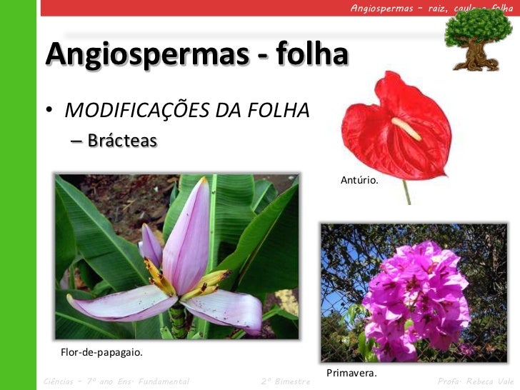 43. 43. Angiospermas – raiz, caule e folhaAngiospermas - folha• MODIFICAÇÕES DA FOLHA – Brácteas Antúrio. Flor-de-papagaio. Primavera.Ciências – 7º ano Ens. Fundamental 2º Bimestre Profa. Rebeca Vale