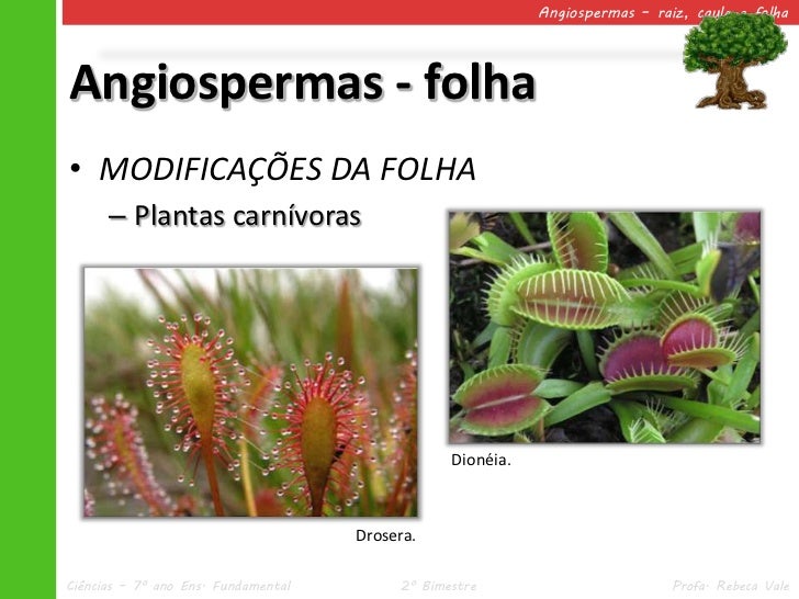 45. 45. Angiospermas – raiz, caule e folhaAngiospermas - folha• MODIFICAÇÕES DA FOLHA – Plantas carnívoras Dionéia. Drosera.Ciências – 7º ano Ens. Fundamental 2º Bimestre Profa. Rebeca Vale