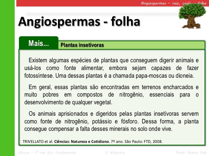 46. 46. Angiospermas – raiz, caule e folhaAngiospermas - folha Mais... Plantas insetívoras Existem algumas espécies de plantas que conseguem digerir animais e usá-los como fonte alimentar, embora sejam capazes de fazer fotossíntese. Uma dessas plantas é a chamada papa-moscas ou dioneia. Em geral, essas plantas são encontradas em terrenos encharcados e muito pobres em compostos de nitrogênio, essenciais para o desenvolvimento de qualquer vegetal. Os animais aprisionados e digeridos pelas plantas insetívoras servem como fonte de nitrogênio, potássio e fósforo. Dessa forma, a planta consegue compensar a falta desses minerais no solo onde vive. TRIVELLATO et al. Ciências: Natureza e Cotidiano. 7º ano. São Paulo: FTD, 2008.Ciências – 7º ano Ens. Fundamental 2º Bimestre Profa. Rebeca Vale