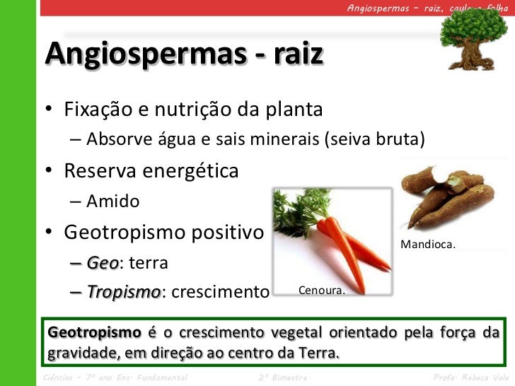 5. 5. Angiospermas – raiz, caule e folhaAngiospermas - raiz• Fixação e nutrição da planta – Absorve água e sais minerais (seiva bruta)• Reserva energética – Amido• Geotropismo positivo Mandioca. – Geo: terra – Tropismo: crescimento Cenoura. Geotropismo é o crescimento vegetal orientado pela força da gravidade, em direção ao centro da Terra.Ciências – 7º ano Ens. Fundamental 2º Bimestre Profa. Rebeca Vale