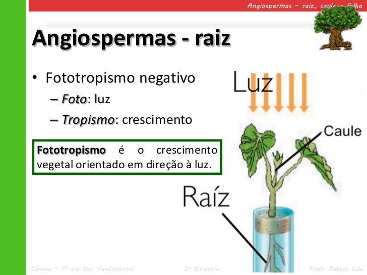 6. 6. Angiospermas – raiz, caule e folhaAngiospermas - raiz• Fototropismo negativo – Foto: luz – Tropismo: crescimento Fototropismo é o crescimento vegetal orientado em direção à luz.Ciências – 7º ano Ens. Fundamental 2º Bimestre Profa. Rebeca Vale