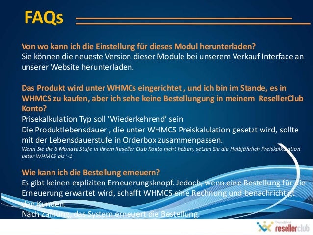 28. 28. FAQsVon wo kann ich die Einstellung für dieses Modul herunterladen?Sie können die neueste Version dieser Module bei unserem Verkauf Interface anunserer Website herunterladen.Das Produkt wird unter WHMCs eingerichtet , und ich bin im Stande, es inWHMCS zu kaufen, aber ich sehe keine Bestellungung in meinem ResellerClubKonto?Prisekalkulation Typ soll ‘Wiederkehrend’ seinDie Produktlebensdauer , die unter WHMCS Preiskalulation gesetzt wird, solltemit der Lebensdauerstufe in Orderbox zusammenpassen.Wenn Sie die 6 Monate Stufe in Ihrem Reseller Club Konto nicht haben, setzen Sie die Halbjährlich Preiskalkulationunter WHMCS als -1Wie kann ich die Bestellung erneuern?Es gibt keinen expliziten Erneuerungsknopf. Jedoch, wenn eine Bestellung für dieErneuerung erwartet wird, schafft WHMCS eine Rechnung und benachrichtigtden Kunden.Nach Zahlung, das System erneuert die Bestellung..