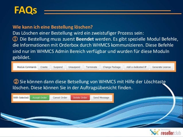 29. 29. FAQsWie kann ich eine Bestellung löschen?Das Löschen einer Bestellung wird ein zweistufiger Prozess sein:① Die Bestellung muss zuerst Beendet werden. Es gibt spezielle Modul Befehle,die Informationen mit Orderbox durch WHMCS kommunizieren. Diese Befehlesind nur im WHMCS Admin Bereich verfügbar und wurden für diese Modulngebildet. ② Sie können dann diese Betsellung von WHMCS mit Hilfe der Löschtastelöschen. Diese können Sie in der Auftragsübersicht finden.