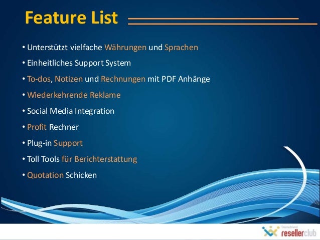 3. 3. Feature List• Unterstützt vielfache Währungen und Sprachen• Einheitliches Support System• To-dos, Notizen und Rechnungen mit PDF Anhänge• Wiederkehrende Reklame• Social Media Integration• Profit Rechner• Plug-in Support• Toll Tools für Berichterstattung• Quotation Schicken