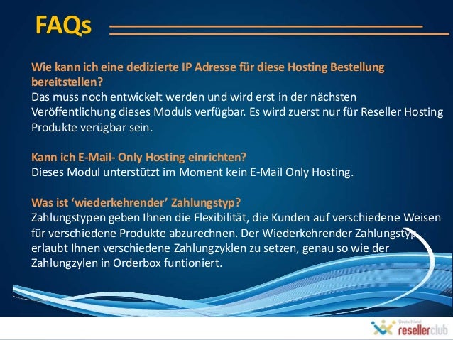 30. 30. FAQsWie kann ich eine dedizierte IP Adresse für diese Hosting Bestellungbereitstellen?Das muss noch entwickelt werden und wird erst in der nächstenVeröffentlichung dieses Moduls verfügbar. Es wird zuerst nur für Reseller HostingProdukte verügbar sein.Kann ich E-Mail- Only Hosting einrichten?Dieses Modul unterstützt im Moment kein E-Mail Only Hosting.Was ist ‘wiederkehrender’ Zahlungstyp?Zahlungstypen geben Ihnen die Flexibilität, die Kunden auf verschiedene Weisenfür verschiedene Produkte abzurechnen. Der Wiederkehrender Zahlungstyperlaubt Ihnen verschiedene Zahlungzyklen zu setzen, genau so wie derZahlungzylen in Orderbox funtioniert.