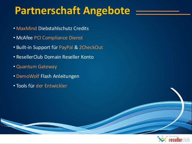 4. 4. Partnerschaft Angebote• MaxMind Diebstahlschutz Credits• McAfee PCI Compliance Dienst• Built-in Support für PayPal & 2CheckOut• ResellerClub Domain Reseller Konto• Quantum Gateway• DemoWolf Flash Anleitungen• Tools für der Entwickler