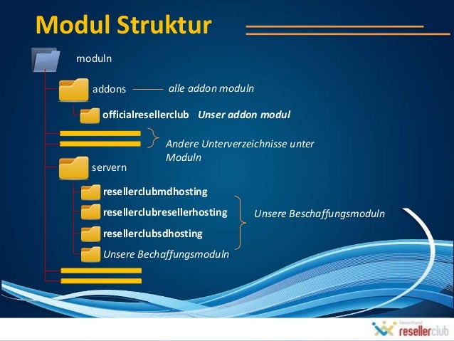 6. 6. Modul Struktur moduln addons alle addon moduln officialresellerclub Unser addon modul Andere Unterverzeichnisse unter Moduln servern resellerclubmdhosting resellerclubresellerhosting Unsere Beschaffungsmoduln resellerclubsdhosting Unsere Bechaffungsmoduln